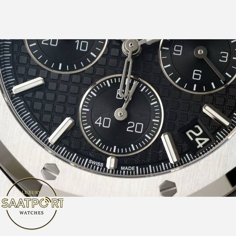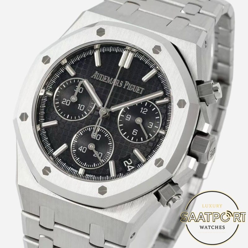 Zamanın ötesinde bir tasarım anlayışıyla üretilen Audemars Piguet Royal Oak Chronograph 26240ST, lüks saat dünyasında ayrıcalıklı bir yere sahip. DDF Factory tarafından titizlikle üretilen bu model, siyah kadranı, kronograf göstergeleri ve paslanmaz çelik kasasıyla hem teknik mükemmellik hem de zarafeti bir arada sunuyor.