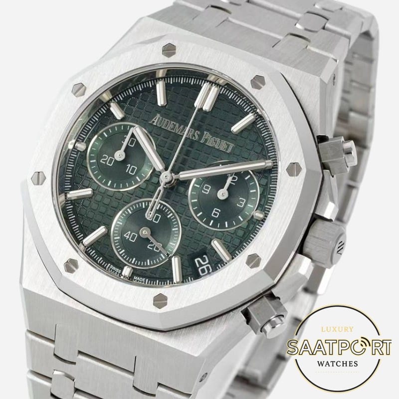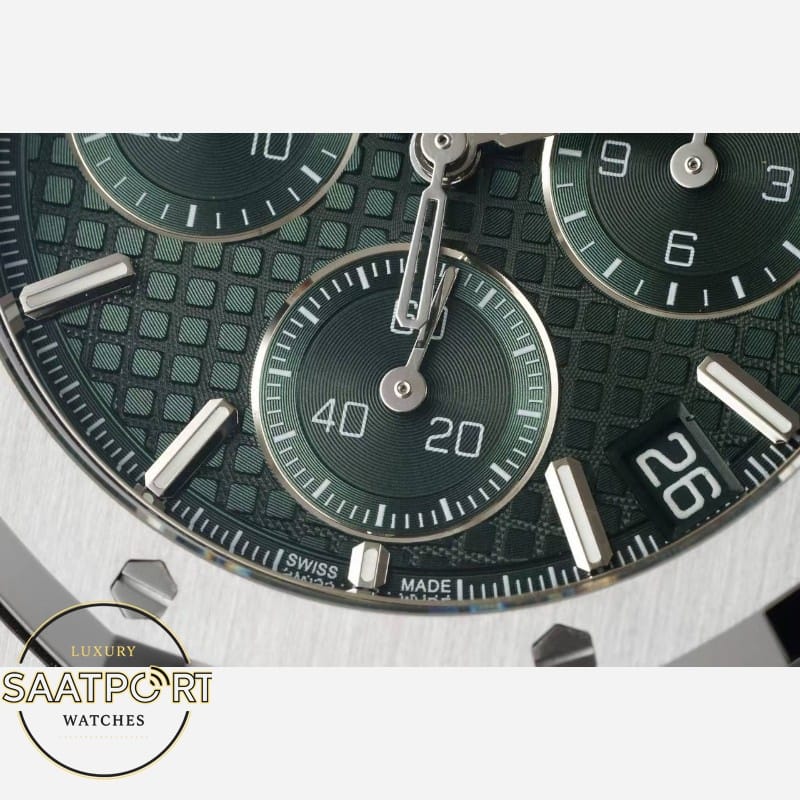 Audemars Piguet Royal Oak Chronograph 26240ST Green Dial, sadece bir zaman ölçer değil; stil, statü ve mühendisliğin birleşimidir. DDF Factory’nin üstün işçiliğiyle üretilen bu model, hem koleksiyonluk bir parça hem de günlük kullanım için benzersiz bir seçenektir.