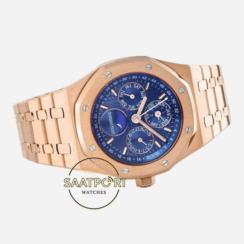 Saat dünyasının en prestijli markalarından biri olan Audemars Piguet, Royal Oak koleksiyonuyla hem estetiği hem de ileri mekanizma teknolojisini buluşturuyor. Royal Oak 41mm Perpetual Calendar 26574OR.OO.1220OR.03, mavi kadranı ve tam altın (full rose) kasa-kordonuyla lüksü en üst seviyede yansıtıyor.