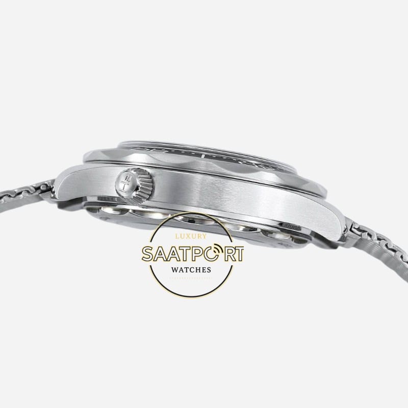 Siyah bezel ve siyah kadran birleşimi, saatin şık ve güçlü bir görünüm sunmasını sağlar. Kadrandaki indeksler yüksek okunabilirlik için özenle tasarlanmıştır.