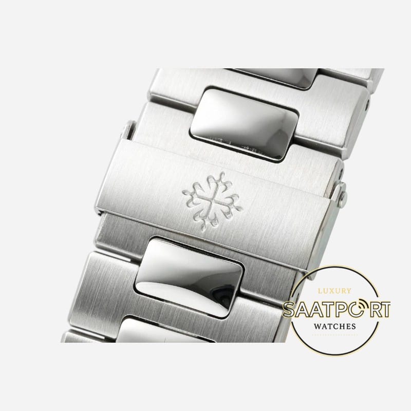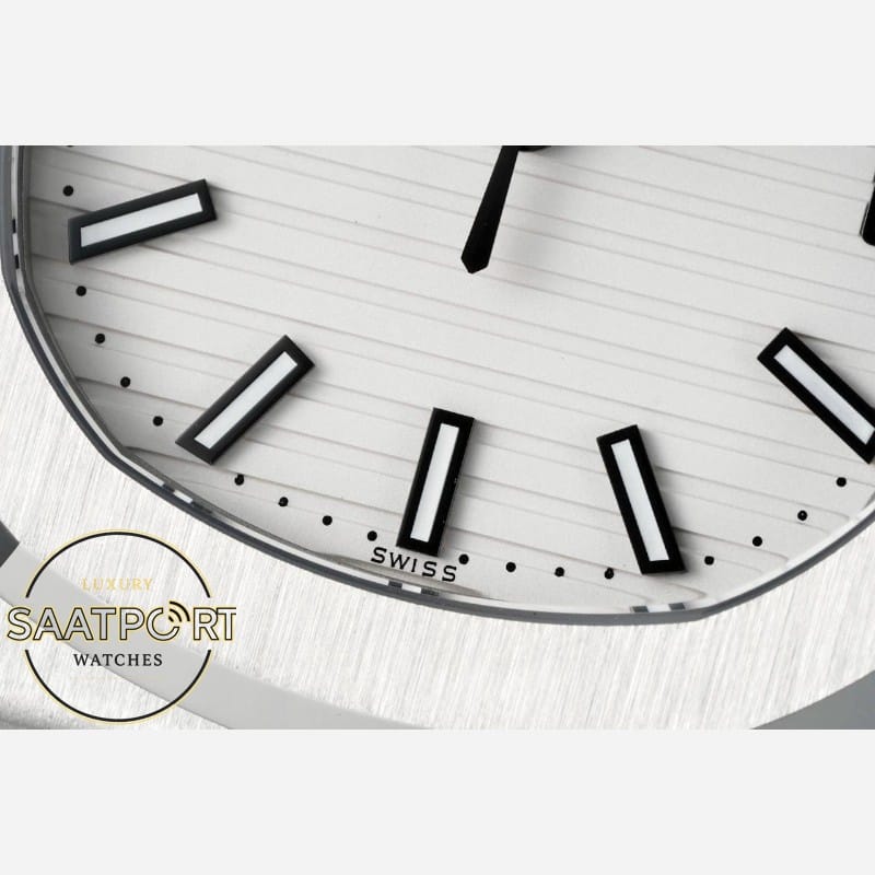 Bu modelin en dikkat çekici özelliği, sade ama etkileyici beyaz kadranıdır. Işığı mükemmel şekilde yansıtan yüzeyi, saatin genel görünümüne zarif bir ferahlık katar. Yatay çizgili kadran yapısı ve ince indeksler, Patek Philippe’in imzası haline gelen Nautilus estetiğini vurgular.