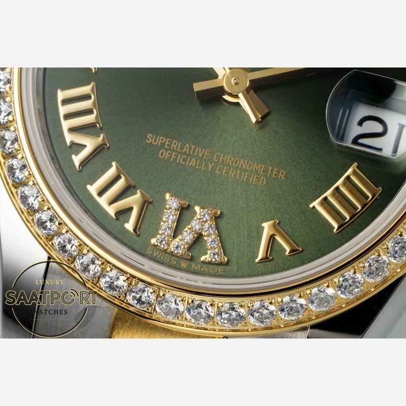 Rolex Datejust 31mm 278383RBR, ARF fabrikası üretimi olup 904L çelik malzeme, safir kristal cam, baget taşlı bezel, yeşil Romen rakamlı kadran ve 2688 Super Clone ETA mekanizmasıyla hem estetik hem de performans açısından üst seviye bir deneyim sunar.