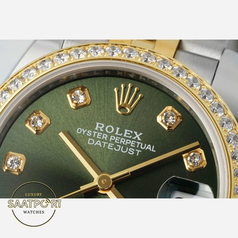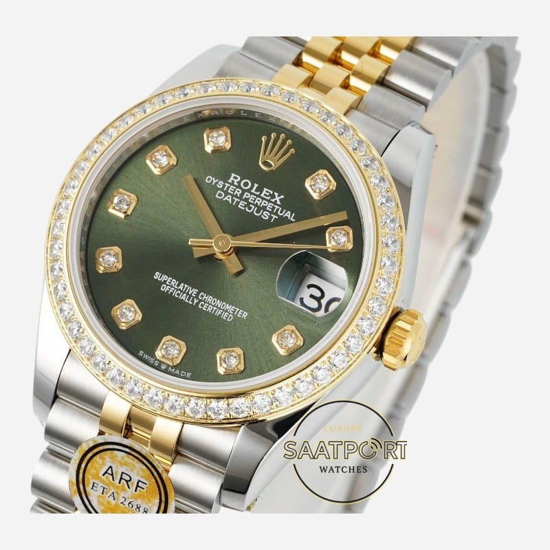 Rolex Datejust 31mm 278273, ARF üretimi olup baget taşlı yeşil kadran, 2688 Super Clone ETA mekanizma, 904L paslanmaz çelik kasa, çift renk Jubilee kordon ve safir kristal camıyla şıklığı ve dayanıklılığı bir arada sunan modern bir modeldir.