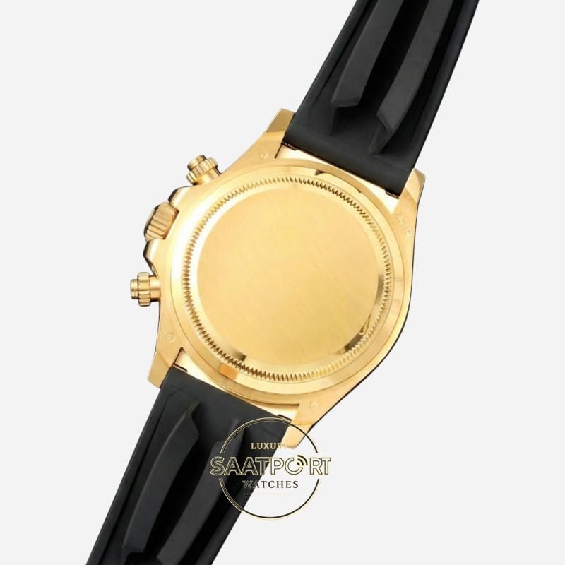 40 mm çapındaki sarı altın tonlu kasa, orijinal ölçülere son derece yakın oranlarda üretilmiştir. Siyah seramik (Cerachrom stil) bezel üzerindeki tachymeter ölçeği; net baskı, yüksek kontrast ve çizilmeye dayanıklı yapı sunar. Safir cam, yansıma kontrolü ve uzun ömürlü berraklık sağlar.