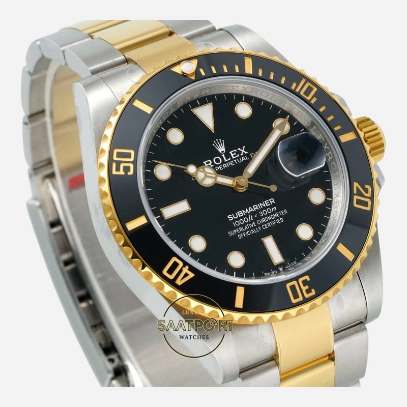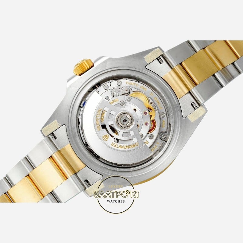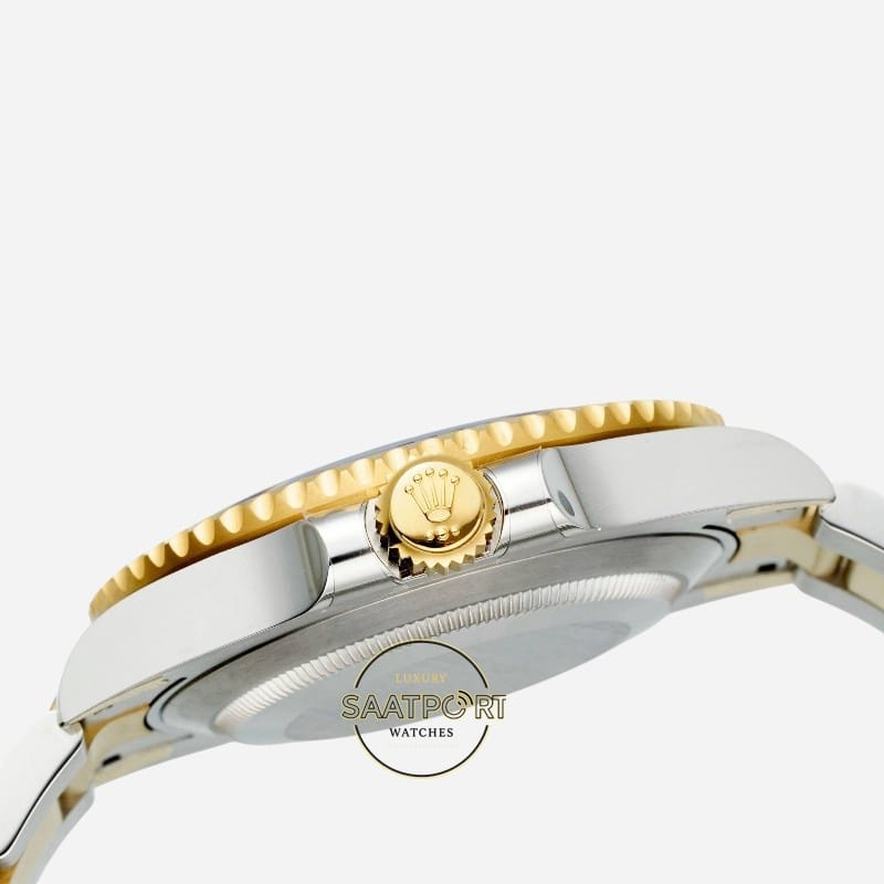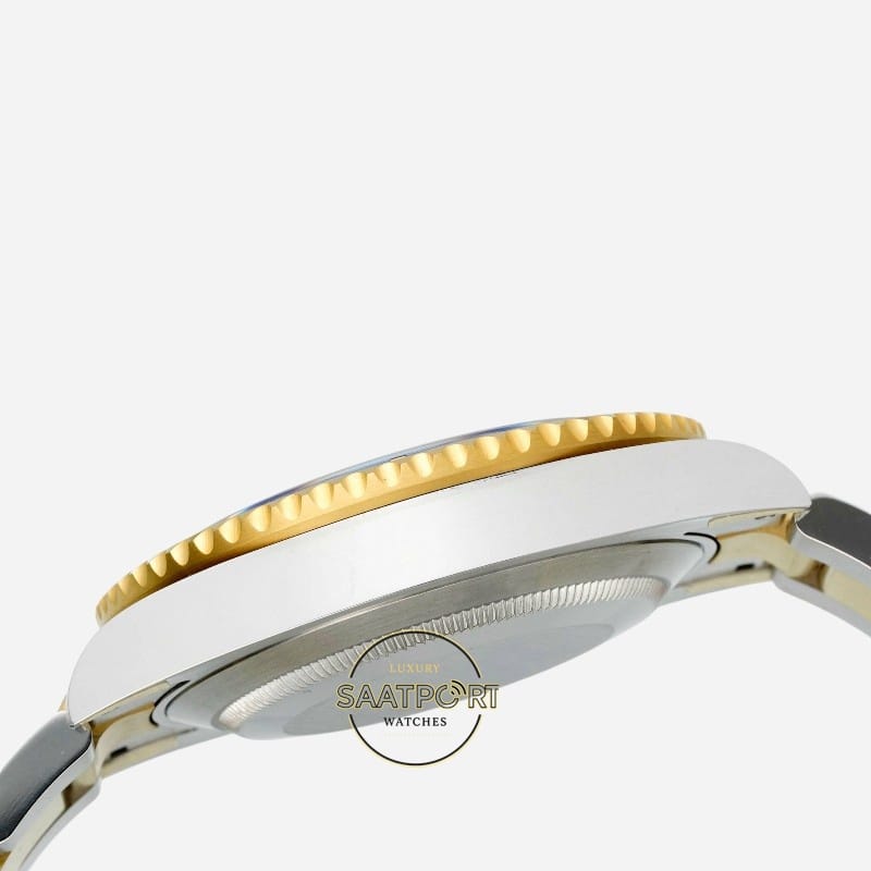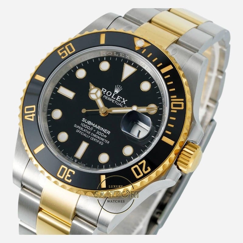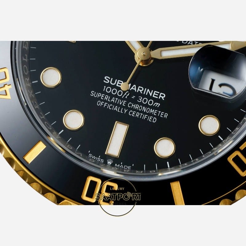 Siyah seramik bezel ve siyah kadran, koyu ve derin bir siyah tonuna sahiptir. Işık altında matlaşmadan netliğini korur. Altın detaylarla birleştiğinde klasik, güçlü ve ciddi bir Submariner görünümü ortaya çıkar.